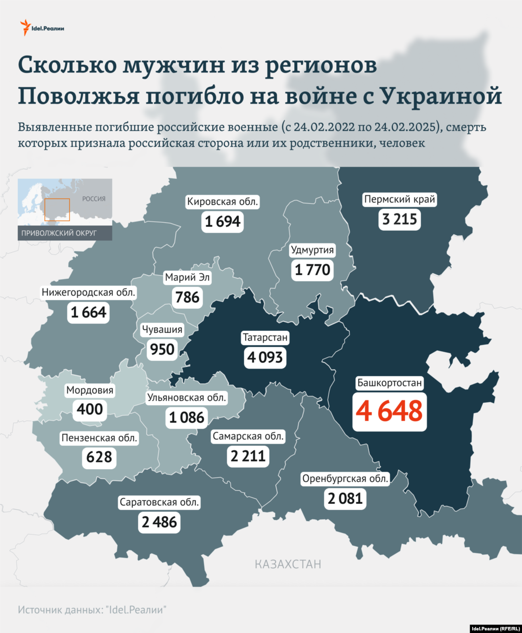 Самое большое количество погибших — из Башкортостана (4 648 человек). На втором месте — Татарстан (4 093 человека). На третьем — Пермский край (3 215 человек).